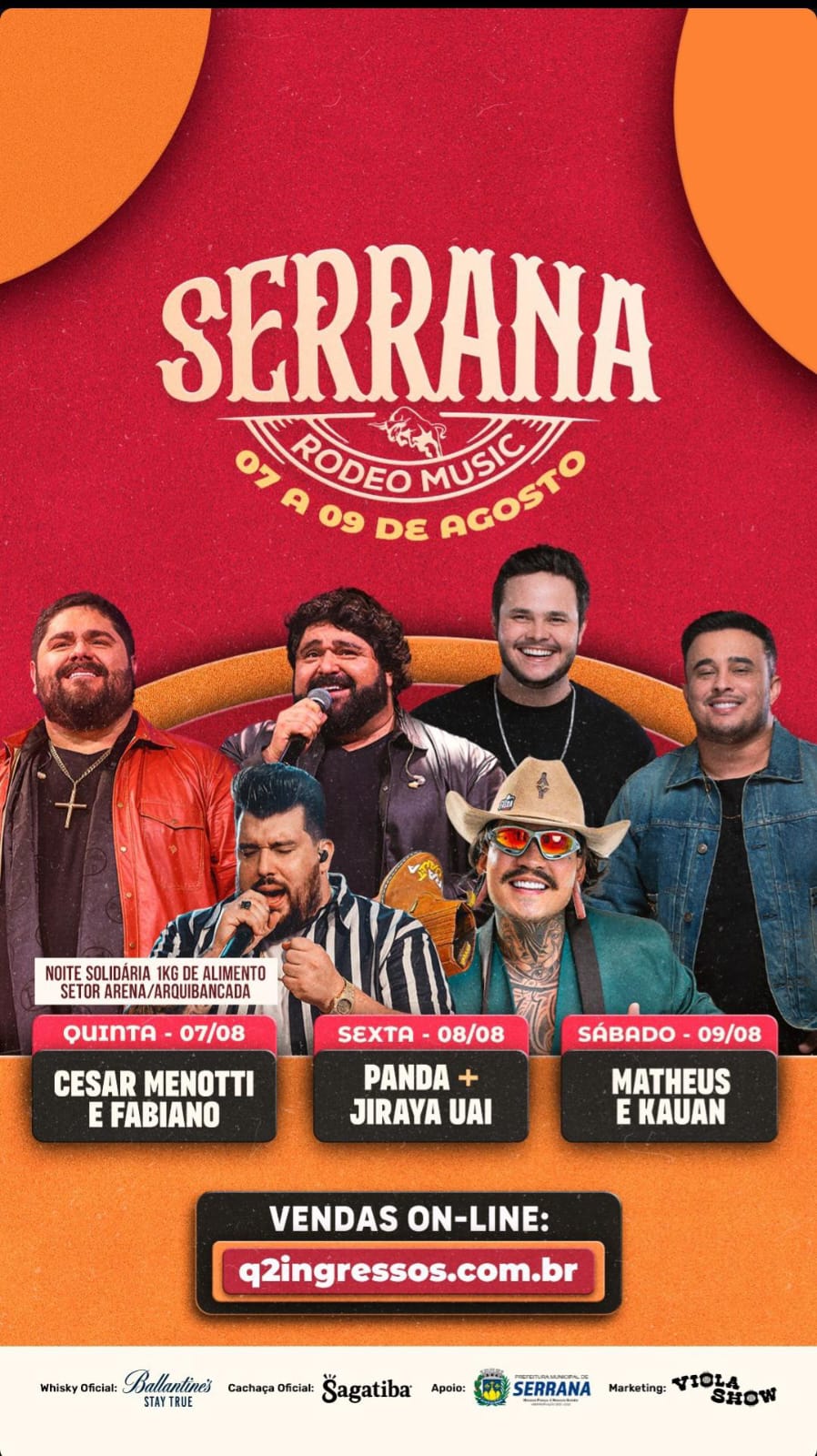 A Prefeitura de Serrana anunciou que o público terá mais uma oportunidade de curtir o Serrana Rodeo Music trocando ingresso por 1 kg de alimento não perecível. A iniciativa, que já valia para a quinta-feira (07), dia da apresentação de César Menotti & Fabiano, agora também se estende à sexta-feira (08), quando sobem ao palco o cantor Panda e o DJ Jiraya Uai.