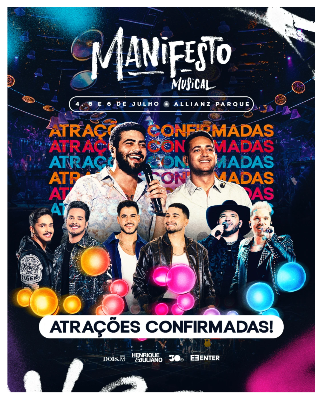 A contagem regressiva para um dos shows mais aguardados do ano, já começou! A dupla Henrique & Juliano, promete um espetáculo histórico nos dias4, 5 e 6 de julho, no Allianz Parque, em São Paulo, onde irão comandar o "Manifesto Musical". O evento se tornará inesquecível, pois marca o feito histórico de esgotar três datas consecutivas em um dos maiores estádios do Brasil.