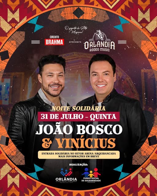 Noite Solidária, com o super show da dupla JOÃO BOSCO E VINÍCIUS, no dia 31 de julho, quinta-feira, no Orlândia Rodeo Music.